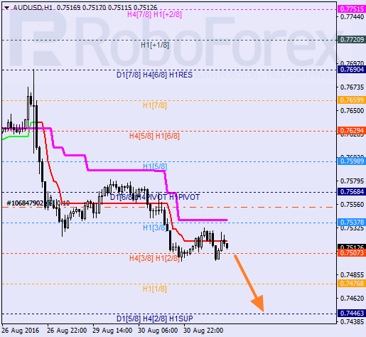 H4: para odbiła od 6/8 i wznowiła spadek w rezultacie linie trendowe utworzyły „krzyż śmierci”. Jest wysoce prawdopodobne, że po ukończeniu lokalnej korekty rynek może kontynuować ruch w dół. Najbliższym celem jest 1/8.