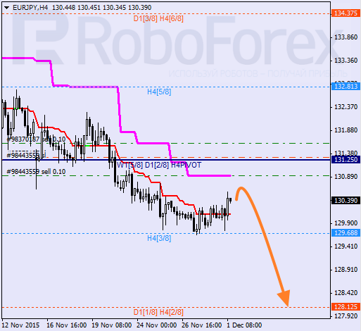 H1: po odbiciu od 0/8 para rozpoczęła korektę. Jeśli rynek przełamie poziom 2/8 ruch w dół może być kontynuowany. W tym przypadku cena może przełamać również -2/8, wówczas linie MM zostaną przerysowane.