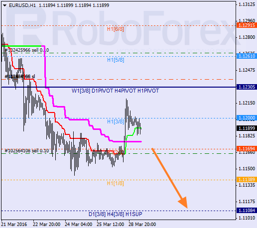 H1: cena porusza się w środkowej części linii MM. Pomimo uformowanego „złotego krzyża” para zdołała pozostać poniżej 3/8, a więc może wznowić ruch w dół. Jeśli cena przełamie 2/8 niedźwiedzie mogą powrócić na rynek i kontynuować ruch w kierunku 0/8.