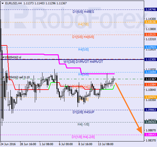 H4: para zawróciła od dziennej linii trendowej i lekko zamarkowała poziom 3/8. Możliwe jest w krótkim terminie wznowienie spadków, które będą potwierdzone przez spadek ceny poniżej linii trendowej H4.