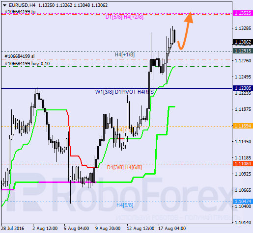 H1: w celu potwierdzenia nowego ruchu wzrostowego para musi odbić od +1/8 i linii trendowej. W innym przypadku jeśli cena przełamie te poziomy obecna korekta może być głębsza.