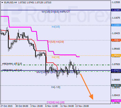 H1: para porusza się w dolnej części linii MM. Linie trendowe uformowały „krzyż śmierci”. Prawdopodobnym jest, że cena zdoła przełamać poziom -2/8. W tym przypadku linie MM zostaną przerysowane.