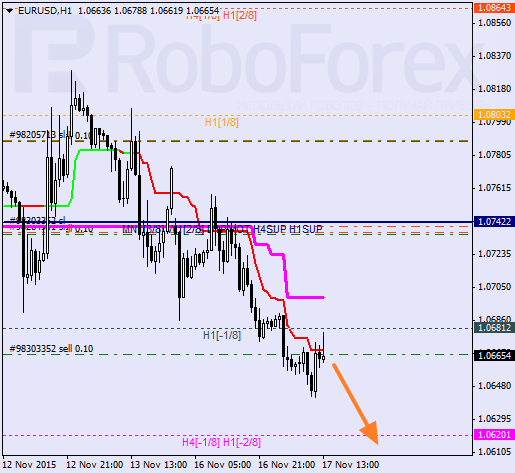 H1: para porusza się w dolnej części linii MM. Linie trendowe uformowały „krzyż śmierci”. Prawdopodobnym jest, że cena zdoła osiągnąć poziom -2/8 w najbliższej przyszłości.