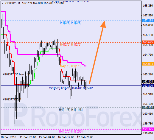 H4: para nie zdołała pozostać poniżej 4/8 i obecnie przebywa w korekcie. Najbliższym celem dla byków jest 2/8 i dzienna linia trendowa. Jak cena zdoła pozostać nad linią trendową H4, rynek może wznowić swój wzrost.