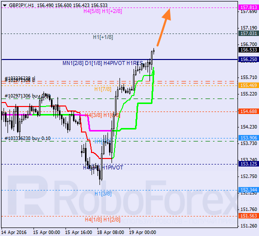 H1: po odbiciu od linii trendowej para przełamała 8/8. Jeśli później cena zdoła pozostać nad tym poziomem rynek może kontynuować ruch w górę w kierunku +2/8.