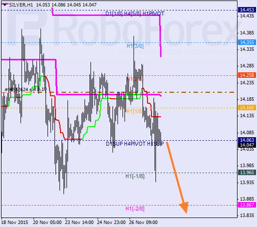 H1: cena próbuje przedostać się do strefy wyprzedania. W końcówce zeszłego tygodnia linie trendowe uformowały „krzyż śmierci”. Jeśli cena zdoła pozostać nad 0/8, ruch zniżkowy może być kontynuowany.