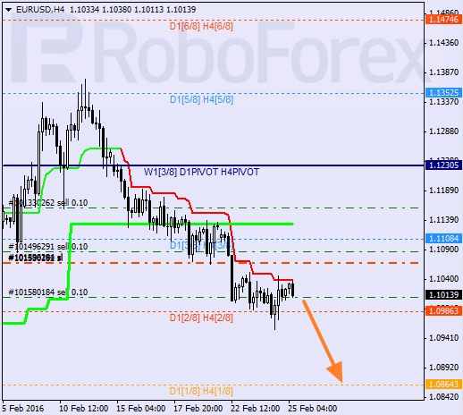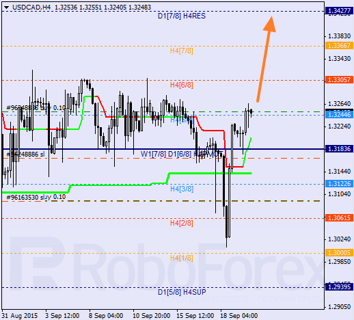 H4: USDCAD próbuje pozostać nad 5/8. Linie trendowe wciąż są pod wpływem „krzyża śmierci”. Najbliższym celem jest 8/8. Po jego osiągnięciu rynek może rozpocząć korektę zniżkową.