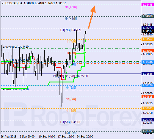 H4: notowania pary kontynuują wzrosty. Po odbiciu się od poziomu 6/8, cena osiągnęła prawie poziom 8/8 i może go przełamać. W tym przypadku możemy zobaczyć kolejny ruch wzrostowy wewnątrz strefy wykupienia w kierunku +2/8.