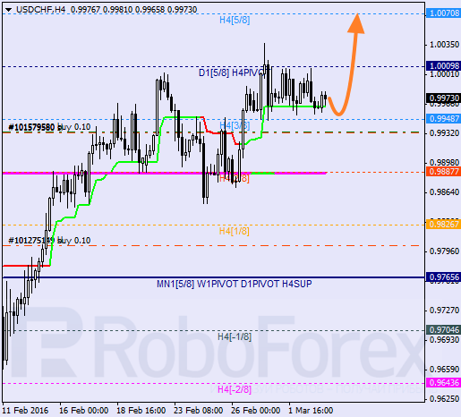 H4: frank przebywa w korekcie. Linia trendowa na H4 i poziom 3/8 wspiera cenę. W późniejszym czasie wznowienie wzrostu do 5/8 jest możliwe.