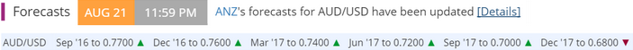 Choć prognozy banku wskazują na stopniową deprecjację AUD od tego momentu, stratedzy spodziewają się, że AUD będzie handlowany w granicach 0,70-0,78 względem dolara amerykańskiego przed złamaniem tej konsolidacji w drugiej połowie 2017.