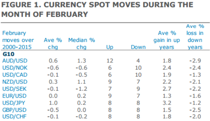 Wśród grona G10 AUD pokazywał najwyższą tendencję to aprecjacji w stosunku do USD, rosnąc 12 z 16 ostatnich lat (w każdym kolejnym lutym).