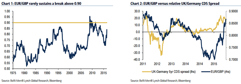 Bank jednak nie dostrzega takowych rozbieżności, nie oczekując przy tym, że ponownie pojawią się one w najbliższej przyszłości. Na początku roku bank podkreślał rosnącą za ryzyko Brexitu, która budowana była w wielu miarach, między innymi spread w stawkach CDS między UK a Niemiec, który rozszerzył się w miarę jak koszt zabezpieczenia się przed niewypłacalnością UK (CDS) poszybował w górę.