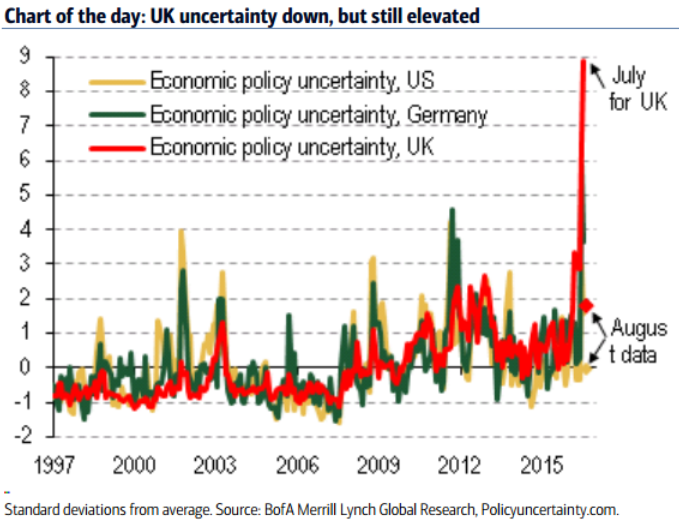Stratedzy BofA wskazują, że po słabym lipcu dane makro odbiły do takiego stopnia, który prawdopodobnie odpowiada niższej niepewności gospodarczej, którą bank przedstawia na poniższym wykresie.