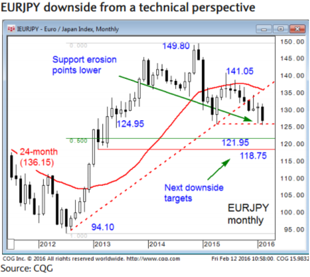 Tym samym bank rekomenduje shorty na EURJPY przed posiedzeniami EBC w marcu o czerwcu. Bank oczekuje ruchu na przez poniżej wsparcia na 125 w celu otwarcia przestrzeni do dalszych celów na 122 i później na 118,75.