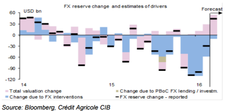 W szczególności CA spogląda na rosnące rezerwy walutowe, po raz pierwszy od października 2016, aczkolwiek z powodu zmian w wycenie o 42 mld USD do 3,245 bln USD. CA również dostrzega szansę na wzrost podaży pieniądza M2 do 14% r/r, dopasowując się do danych styczniowych – najlepszych od 1,5 roku.