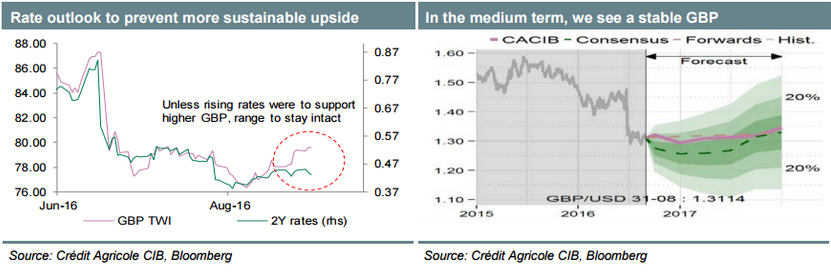 Stratedzy banku zauważają, że notowania GBP odbijają od po-Brexitowych minimów. Główną przyczyną jest seria ostatnich lepszych od oczekiwań danych makro, sugerując mniejszy zasięg do agresywniejszego działania przez BoE.
