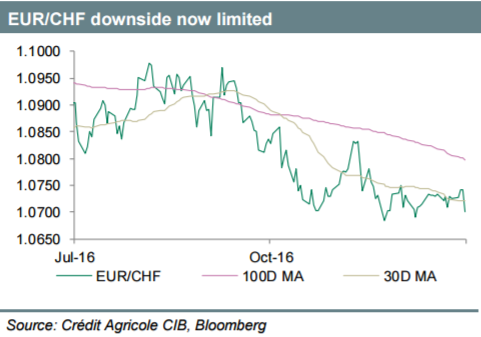 Ponadto bank zaznacza, że przewartościowany frank wciąż utrzymuje ciasne warunki finansowe, zbyt restrykcyjne. Z tego punktu widzenia CA nie spodziewa się, że SNB będzie tolerował obecny kurs franka przez dłuższy czas.