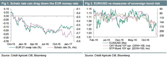 CA wieszczy dalsze spadki rentowności na krótkim końcu krzywej, co ma działać niekorzystnie na rynek wspólnej waluty. EBC będzie więc redukował skup obligacji tuż przed narastającymi ryzykami politycznymi.