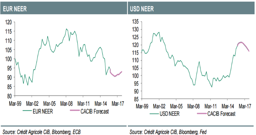 Takie pary jak EURUSD czy też EURGBP powinny być pod presją dywergencji monetarnej. Niemniej EUR powinien pozostać relatywnie bardziej odporny względem walut skorelowanych z ryzykiem oraz z rynkiem surowcowych jak i również CHF i JPY. Parytet na EURUSD nie jest bazowym scenariuszem dla CA na przyszły rok. Bank sądzi, że poprawa w strefie euro przyspieszy i ostatecznie ograniczy zasięg na bardziej agresywne luzowanie monetarne ze strony EBC, budując ścieżkę do odbicia euro w końcówce 2016 i w 2017.