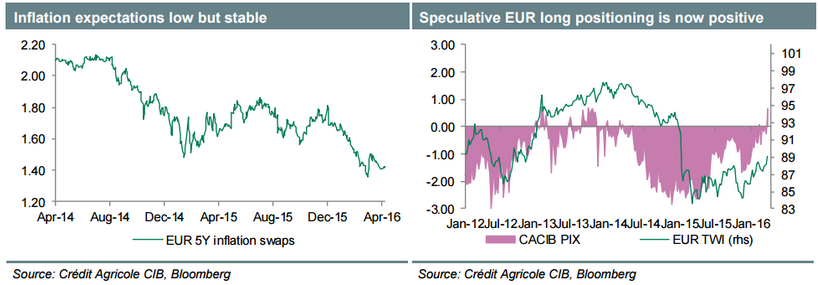 Zdaniem strategów CA niezależnie od średnioterminowych oczekiwań inflacyjnych mierzonych za pomocą swapu 5-letniego pozostającego wciąż blisko historycznych minimów wydaje się, że zasięg na bardziej agresywną politykę EBC jest ograniczony.