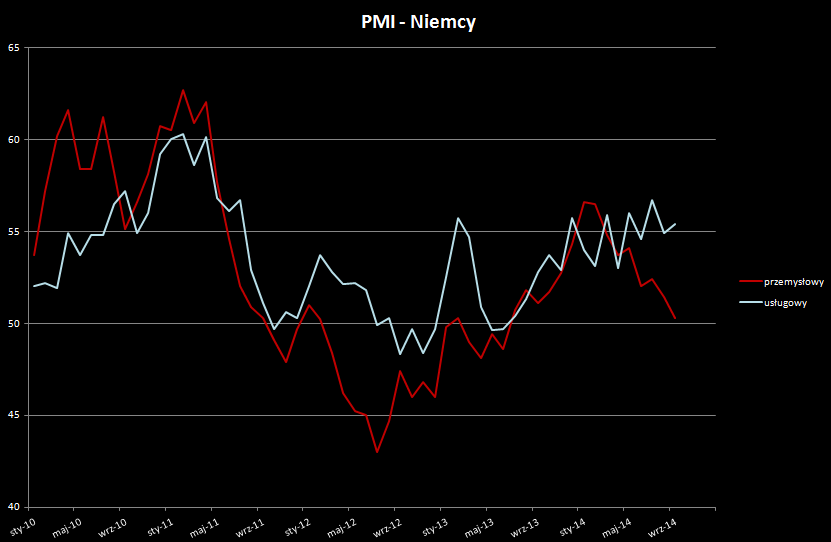 Na koniec jeszcze rzut oka na nastroje w Strefie Euro, które zbliżają się również do bariery 50 punktów, która oddziela ekspansję gospodarczą od recesji. Tutaj również dzisiejszy odczyt przemysłowego PMI był najsłabszy od czerwca 2013. Zatem obraz Niemiec (który już od dawna pod tym kątem nie jest w najlepszej kondycji) możemy traktować nijako próbę dla całego Eurolandu.