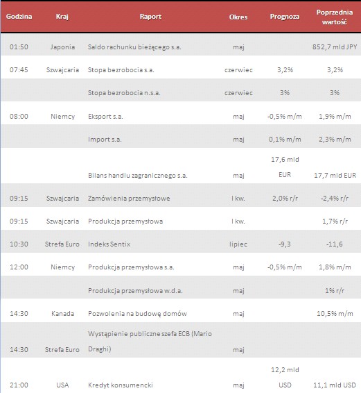Poniedziałkowe dane otwierają odczyty z Japonii. Przed godziną 8:00 poznamy dane z Szwajcarii odnośnie stopy bezrobocia. Godzina 8.00 to dane z Niemiec dotyczące importu i eksportu. 9:15 Szwajcaria (zamówienia, produkcja przemysłowa). O godzinie 10:30 Indeks Sentix ze Strefy Euro. Godzina 14.40 to wystąpienie szefa EBC i dane z Kanady. Szczegóły w tabeli.