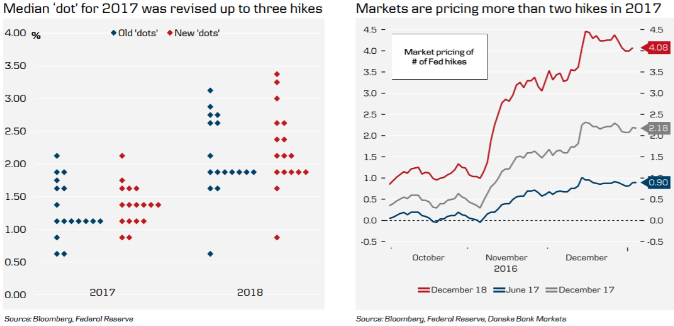 Danske wciąż sądzi, że FED podwyższy stopy dwa razy w tym roku (czerwiec i grudzień), choć sądzi, iż ryzyko jest skierowane w kierunku trzech podwyżek. Jednym z powodów jest to, że FED stał się bardziej gołębi w tym roku w związku ze zmianą w prawie do głosowania.
