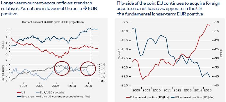 Pierwszy z nich pokazuje pozytywny trend dla euro w długoterminowych pływach na rachunku obrotów bieżących (CA) strefy euro i USA. Obecnie mamy dywergencję między spreadem bilansów CA a kursem EURUSD, która powinna faworyzować wzrosty EURUSD.