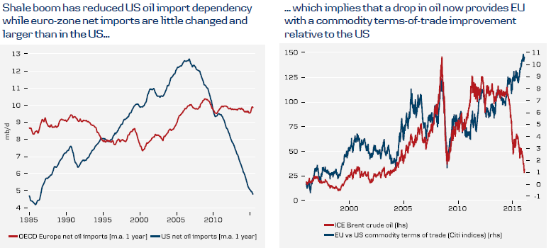 To oczywiście w okresach wysokich cen ropy faworyzowałoby USA i tamtejszą gospodarkę, niemniej w obecnych czasach sytuacja wygląda zgoła inaczej. Jak bardzo niskie ceny surowca szkodzą amerykańskiemu terms of trade doskonale prezentuje prawy wykres (niebieska linia spread terms of trade dla USA i Europy). Widzimy wyraźnie, że wraz ze spadającą ceną ropy relatywny poziom terms of trade rośnie na korzyść starego kontynentu (plus dla euro).