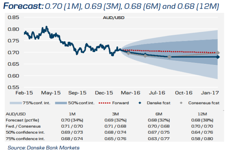 Bank oczekuje odbicia stóp w USA, co może pociągnąć AUDUSD w dół w kolejnych 12 miesiącach. Jednakże Danske zauważa kilka czynników istotnie ograniczających potencjał spadkowy jak: brak przewartościowania, brak oczekiwań cięć stóp przez RBA, stabilizację w Chinach i wciąż blisko historycznych poziomów pozycji krótkich na AUD. Bank zdecydował się podnieść swoją miesięczną prognozę z 0,69 do 0,70. Pozostałe prognozy poniżej.