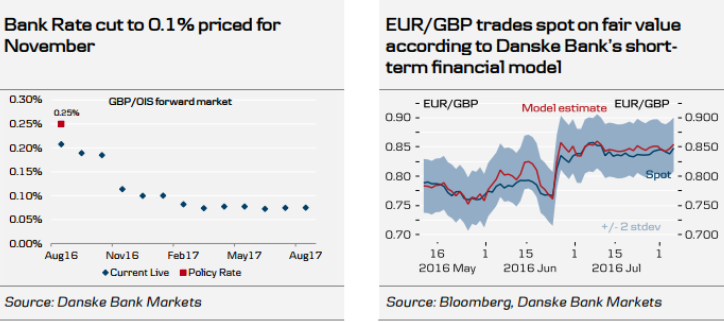 Zgodnie z powyższym stratedzy Danske oczekują, że BoE zetnie stopy o 15 pb do poziomu 0,1% na posiedzeniu listopadowym. Ponadto, BoE ma zwiększyć QE zarówno w części obligacji rządowych jak i prywatnych.