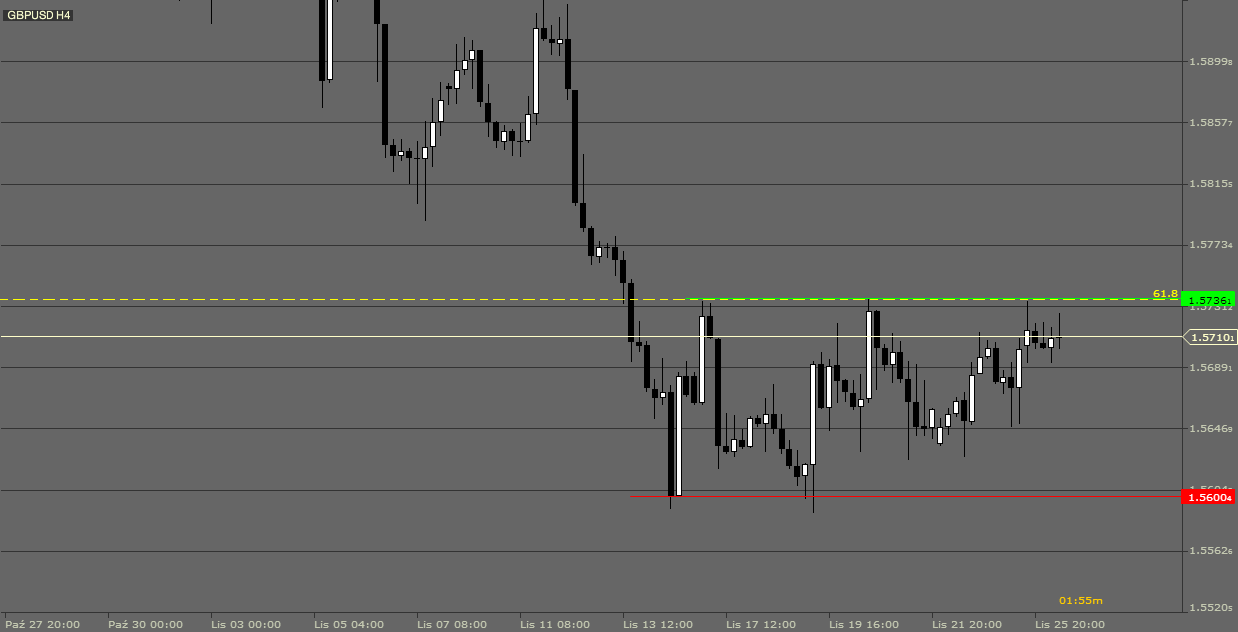 Patrząc technicznie na wykres krótkoterminowy cena zbliża się do oporu w rejonie 1,5736 który również pokrywa się ze zniesieniem 61,8% Fibonacciego ruchu mierzonego na wykresie tygodniowym. Każda próba wybicie tegoż opory jak na razie kończyła się kapitulacją popytu, również obecnie widzimy formowane pro podażowe świece.