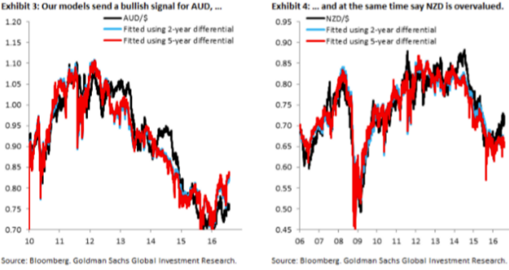 Jednym z głównych sygnałów, jaki nadszedł w ostatnich badań banku jest to, że AUDUSD znajduje się zbyt nisko względem fundamentów. Sygnał ten bank podkreślał już pod koniec maja, kiedy para znajdowała się poniżej 0,72. Sygnał ten zdaniem GS jest wciąż aktywny i wskazuje na poziom powyżej 0,80.
