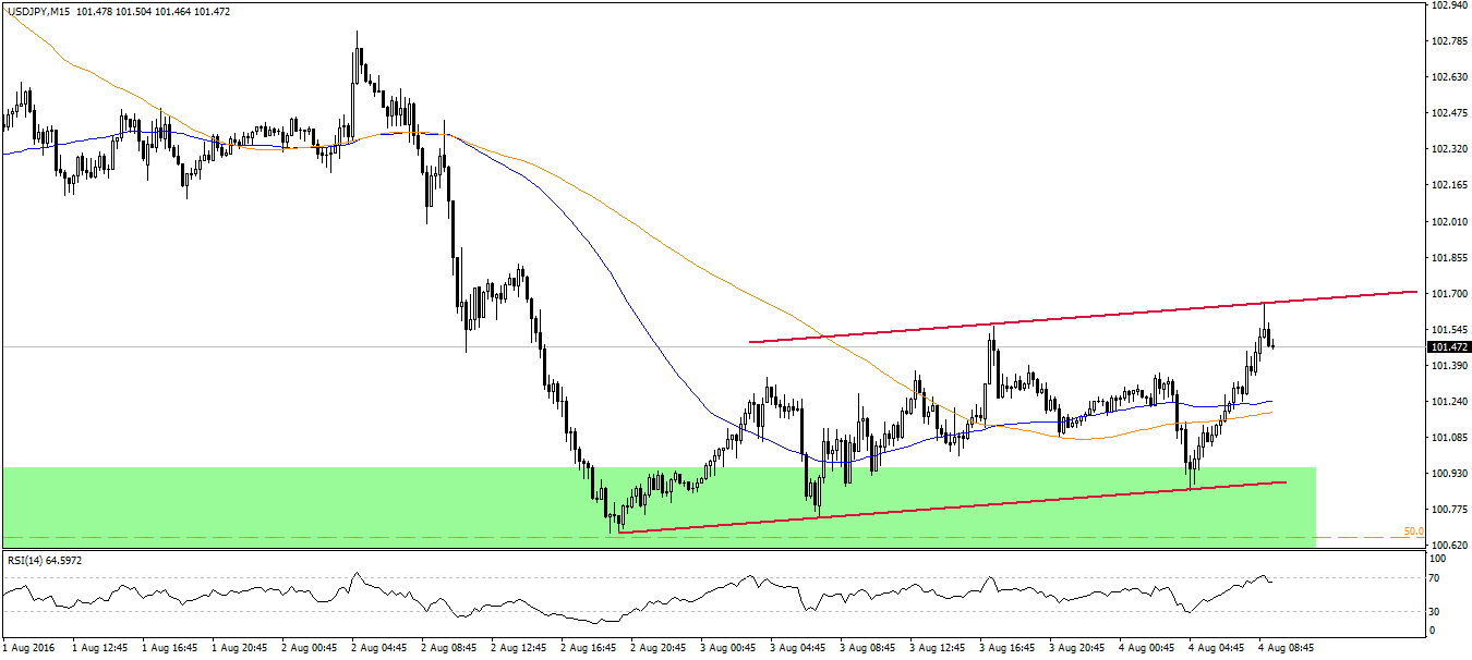 Notowania USDJPY od wczesnego poranka urosły już dość zdecydowanie. O godzinie 8:35 para waha się w rejonie 101,5, niemniej na interwale mamy podażową świeczkę, która może zapowiadać korektę w najbliższym czasie.