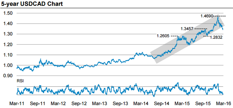 Technicznie sytuacja może sprzyjać spadkom w rejon 1,30, gdzie bank sugeruje możliwość kupna popularnego Loonie’go. Poniżej 5-letni wykres pary wraz z kluczowymi poziomami autorstwa MS.