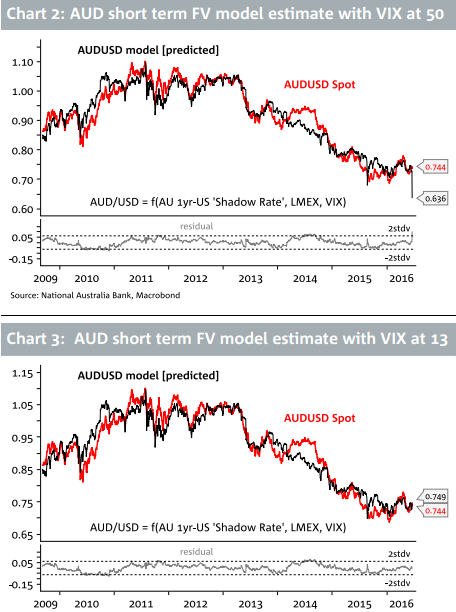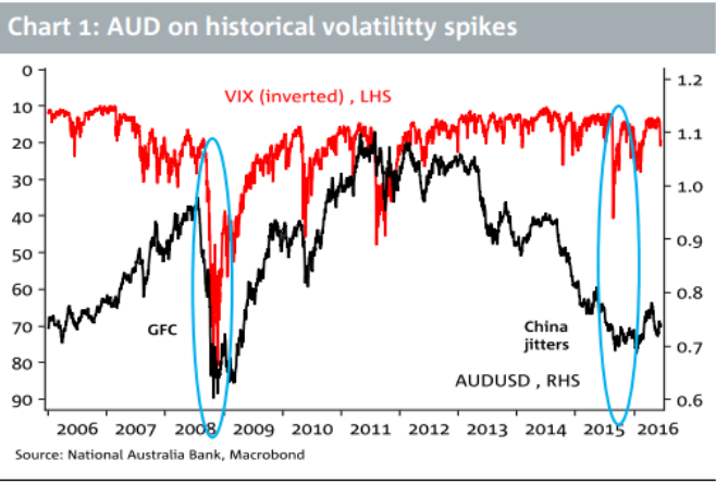 Próbując zmierzyć ilościowo potencjalne implikacje Brexitu na AUD analitycy NAB odnotowują, że w sierpniu w zeszłego roku kiedy chiński rynek akcji i powiązane z nim waluty znajdowały się pod ostrzałem, indeks VIX szybko skoczył z poniżej 20 od powyżej 50, a AUD spadł z ponad 0,74 do poniżej 0,69.