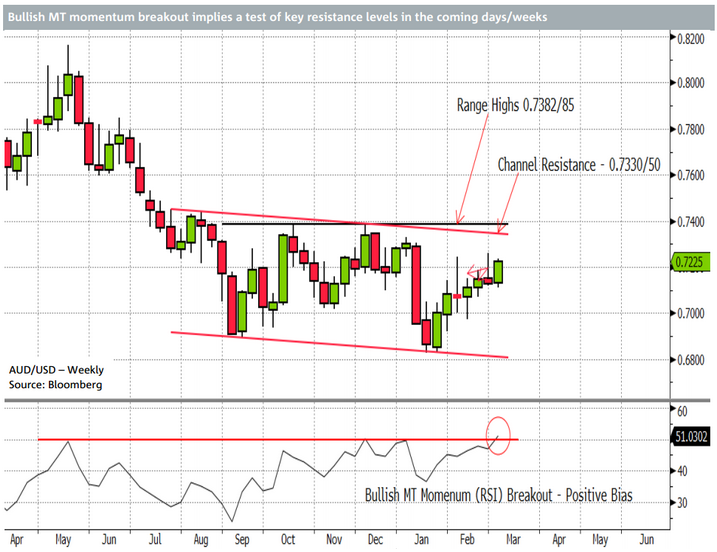 Zdaniem NAB tygodniowe zamknięcie powyżej 0,7385 mogłoby potwierdzić, że trend wzrostowy jest trwały, bazując na wielotygodniowym do wielomiesięcznego wykresu.
