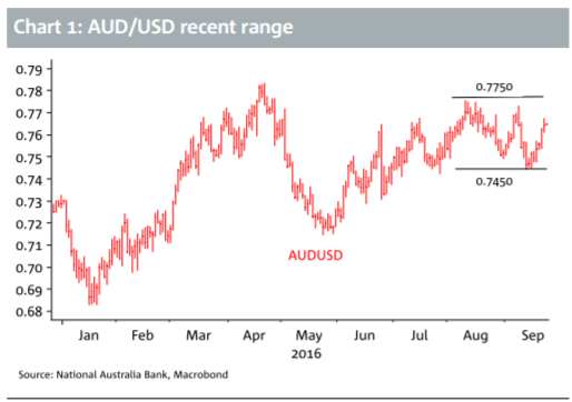 Bank podkreśla, że od czasu wrześniowego posiedzenia FOMC amerykański dolar jest słabszy, co pomaga AUDUSD pozostać w konsolidacji między 0,7450 a 0,7550, który to pułap rozciąga się już blisko dwa miesiące.