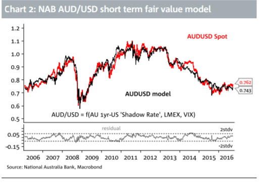 Bank przywołuje wykres zaprezentowany przez członka RBA Kent’a 13 września, który wskazywał, na przewartościowanie AUD rzędu 6% w drugim kwartale oraz koło 8% obecnie. Poziomy te są jednak w dużej mierze zgodne z szacunkami NAB.