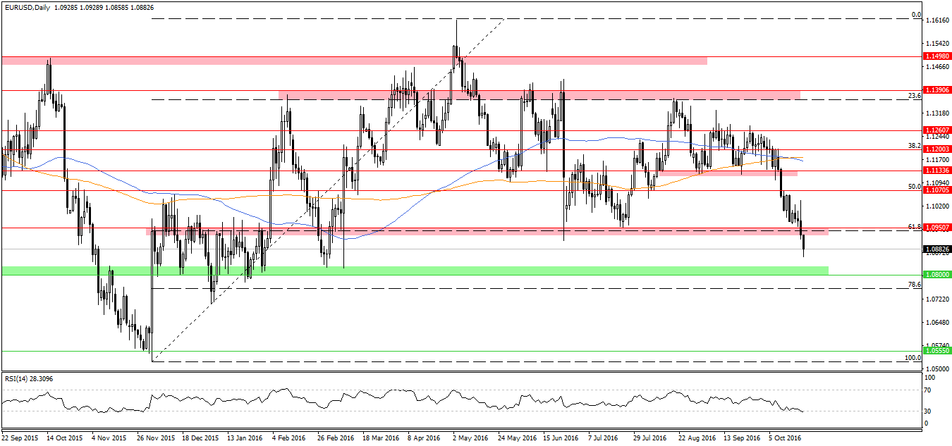 Od strony technicznej notowania EURUSD pod koniec tygodnia wskazały ewidentny kierunek na kolejne dni – spadkowy. Na interwale tygodniowym przełamaliśmy niezwykle ważne wsparcie w pobliżu 1,0950. Obecnie najbliższym celem dla niedźwiedzi wydaje się rejon 1,08. Niemniej w średnim okresie nie można wykluczyć spadku większego kalibru w okolicę 1,0550 a nawet 1,0460 (minimum w tym cyklu).