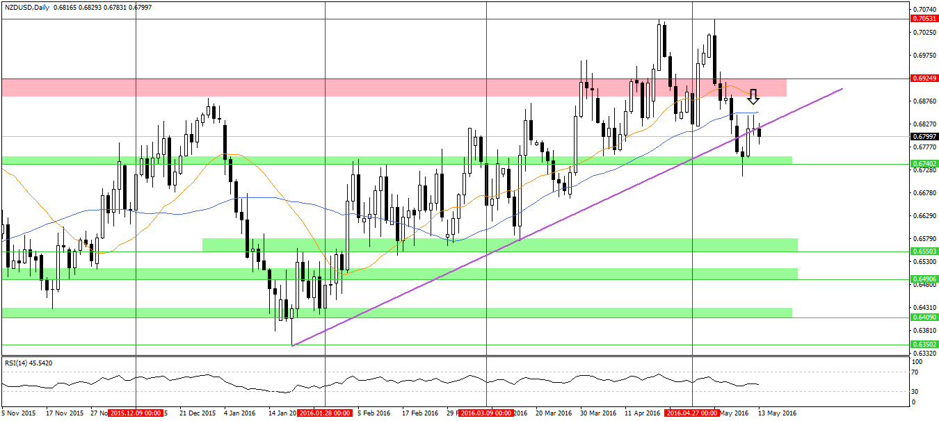 Ponadto wciąż trzeba liczyć się z możliwymi obniżkami stóp procentowych przez RBNZ, który ostatnio takowej decyzji dokonał w marcu. Podczas kwietniowego posiedzenia stopy pozostał niezmienione, co wywołało początkowo wzrostową reakcję na NZDUSD. Jednakże z biegiem czasu impet wzrostowy zanikał, a słowa RBNZ, iż dalsze luzowania monetarne jest możliwe oraz, że deprecjacja kiwi jest pożądana tylko dolały oliwy do ognia.