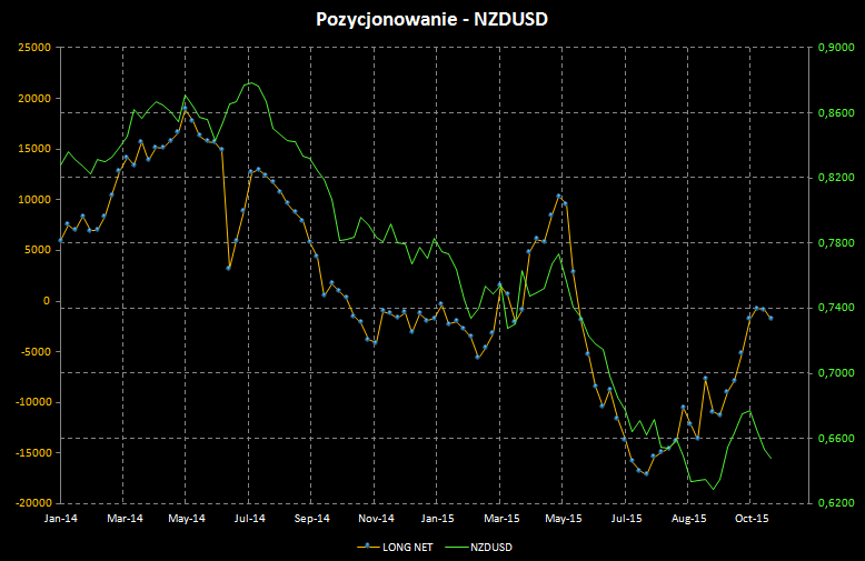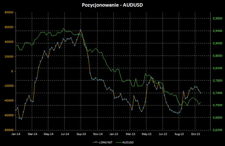 Patrząc na rynek dolara australijskiego zaobserwować możemy już drugi tydzień z rzędu rosnącej pozycji krótkiej netto. Tym samym kurs AUDUSD może tracić przestrzeń do ewentualnego ruchu ku górze, tym bardziej, że surowce ponownie wznowiły swój spadek. Pod uwagę brać należy także podwyżkę stóp przez FED w grudniu, która to powinna wesprzeć USD jak obecna korekta zostanie już wyczerpana.