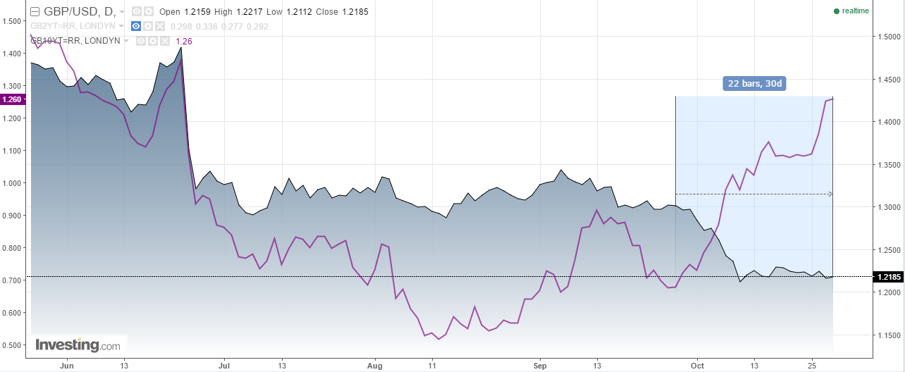 O ile GBP nie reagował pozytywnie na doniesienia o PKB, o tyle rentowności długu w Wielkiej Brytanii (podobnie jak na całym świecie wśród gospodarek rozwiniętych) przeżyły prawdziwy renesans. W ciągu miesiąca rentowność 10-latki odbiła z 0,68% do 1,26%. W analogicznym czasie GBPUSD spadł z 1,30 do okolic 1,22.