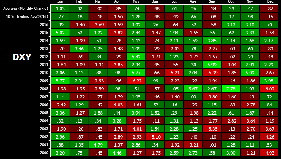 Jakby tego było mało dla indeksu dolara (DXY) styczeń jest statystycznie najlepszym miesiącem z średnim wzrostem przekraczającym 1%. Zatem możemy podsumować, że sezonowo mamy większe prawdopodobieństwo kontynuacji trendu spadkowego na EURUSD.