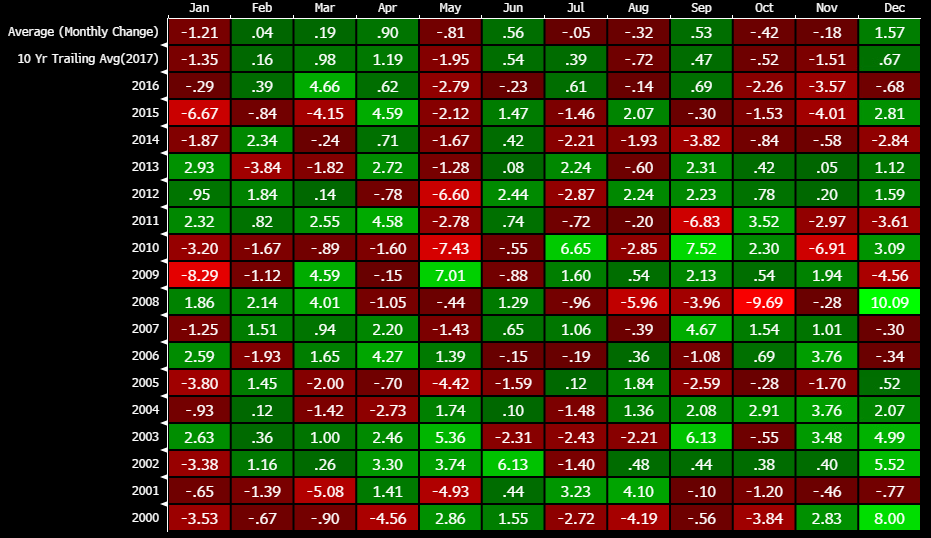Jeżeli weźmiemy pod uwagę 10-letnią średnią kroczącą dla stycznia okazuje się, że średnia strata wynosiła ponad -1,2% względem dolara USA. Gorzej (statystycznie) jest tylko w maju i listopadzie.