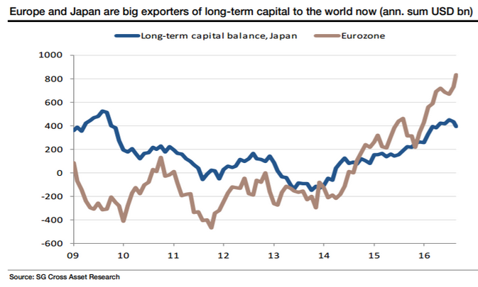 Wykres przez nich zaprezentowany pokazuje roczne, długoterminowe odpływy kapitału z Japonii w ujęciu dolarowym. Z kolei zmiana nastawienia, jaka dokonała się w 2014 roku pomogło niewątpliwie osłabić jena oraz euro.