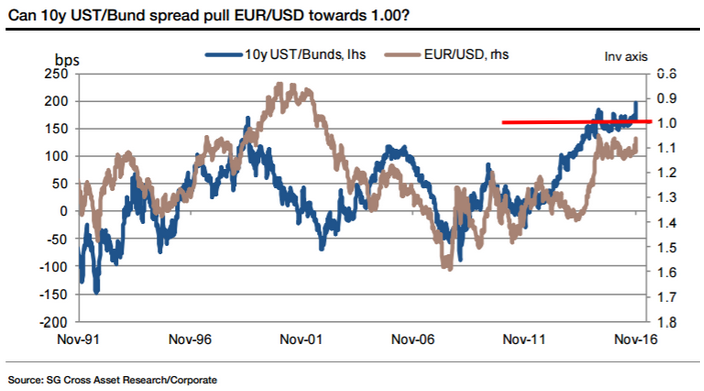 Analitycy SG oczekują parytetu na EURUSD w pierwszym kwartale 2017, przed wzrostem do 1,09 na koniec przyszłego roku. Prognoza oparta jest na dwóch podwyżkach stóp przez FED, jednak istnieje ryzyko ich większej ilości. Przed wyborem Trumpa bank oczekiwał szczytu w stopach w USA na poziomie 1,25-1,5%. Obecnie oczekuje dojścia w tym cyklu do 1,75-2%. Od strony EBC ekonomiści banku sądzą, że od marca rozpocznie się ograniczanie skupu aktywów z celem całkowitego zakończenia programu wczesnym 2018, o ile rynkowe warunki będą temu pozwalać.