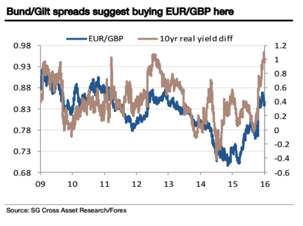 Poza tym Carney wyraźnie podkreślał, że dalsze luzowania polityki jest wciąż możliwe. SG wycenił już dobre dane makro, a jeśli przyjrzymy się względnej różnicy rentowności obligacji UK i Niemiec zobaczymy znajdują się one na absurdalnie niskim poziomie w porównaniu z historią.