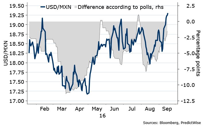 Jak widać na powyższej grafice wraz z kurczącą się przewagą Clinton (szary obszar) notowania USDMNX prują w górę (deprecjacja peso), co wyraźnie wskazuje niechęć do Donalda Trumpa.