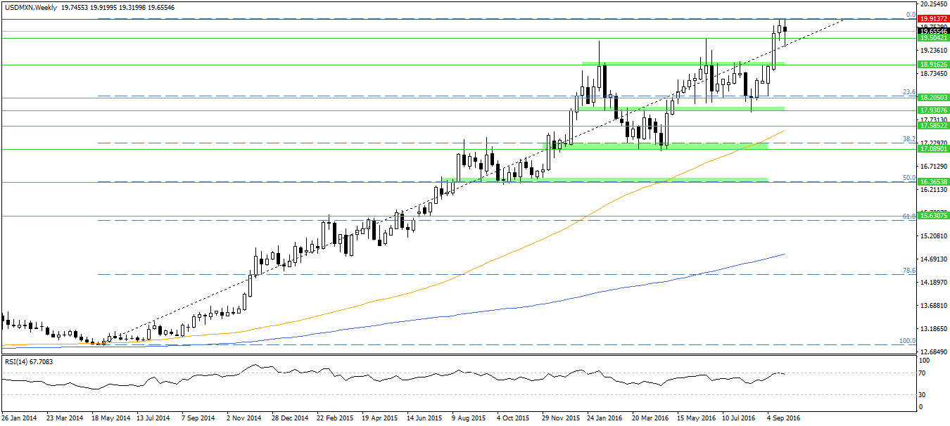 Warto również dopowiedzieć, że każde sondaże pokazujące potencjalną przewagę Trumpa mogą prowadzić parę do przełamania ostatnich szczytów, aczkolwiek obecnie to Clinton wciąż ma pewien bufor bezpieczeństwa. Z kolei z punktu widzenia technicznego na interwale tygodniowym mamy próbę wyrysowania podażowej świeczki.
